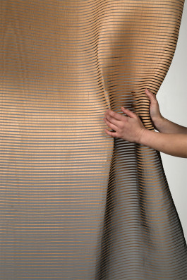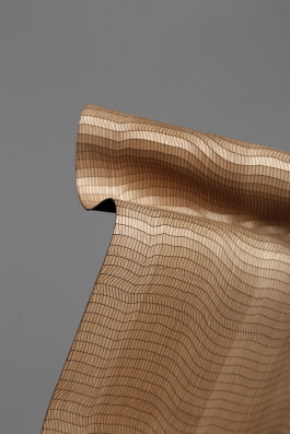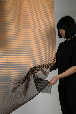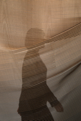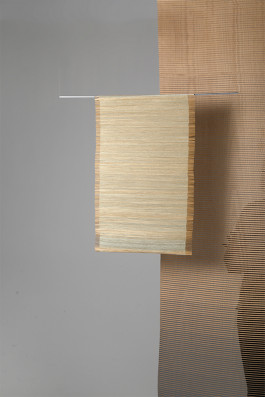 A Softer Wood attends to give a perspective on wood as a regrowing ressource for textile design and to show, which functional and aesthetical potentials the connection of wood and textiles can have. Between stability and flexibility the both materials form a symbiosis. The combination of industrial and textile crafting techniques brings up, among others, a new method to weave wood. The textiles can be used as a curtain, room divider or acoustic steering panel.